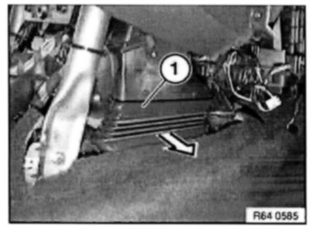 Unclip air duct for rear footwell on right (1) and pull out in direction of arrow.