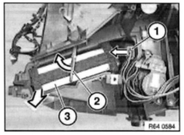 Unclip heating duct for right footwell (2) and remove in direction of arrow.