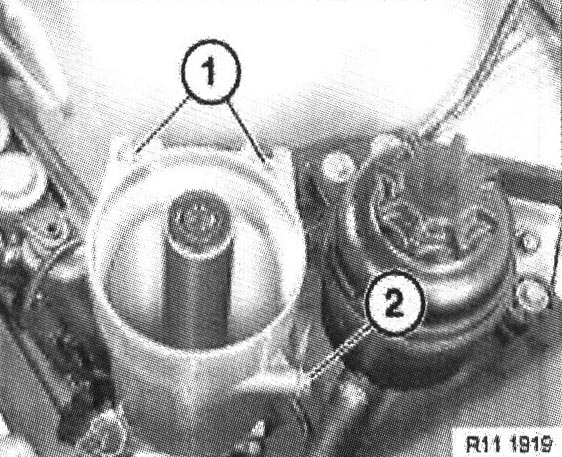 When installing main flow oil filter housing, insert locating pin (1) in locating bore (2).