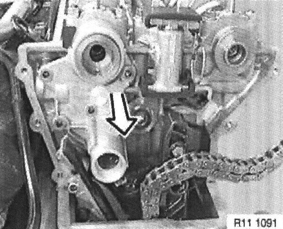 Note: If the camshaft adjustment unit distributor and the seal (three plain compression rings) are worn, the removal operation may be awkward.