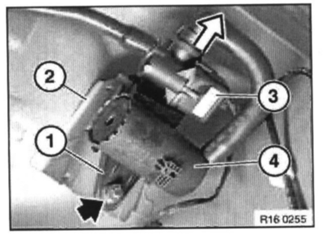 Lift bracket (1) with leakage diagnosis pump (3) and dust filter (4) out of mounting (2).