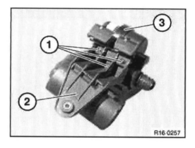 Release screws (1) on rear side of bracket (2) and remove leakage diagnosis pump (3).