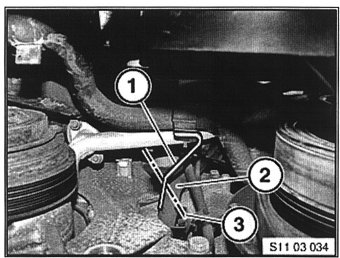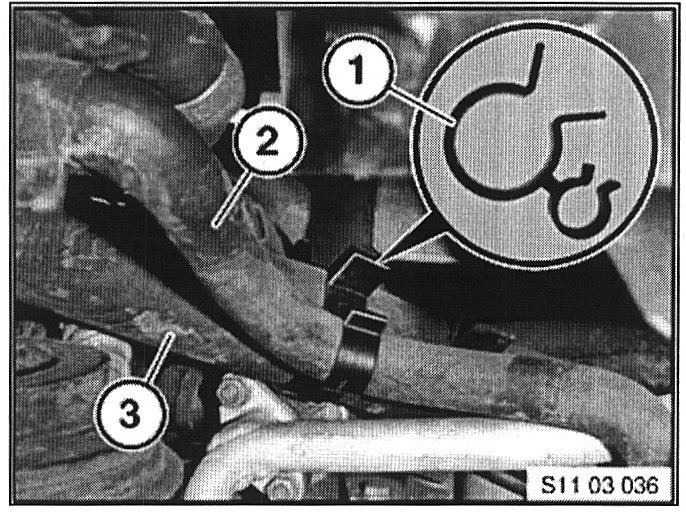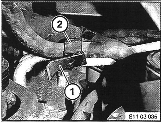 Remove the air conditioner compressor belt tensioner. Cut off the retaining tab (1) on the dipstick tube (2) at the position indicated (3). Remove any burrs on the piece remaining on the vehicle.