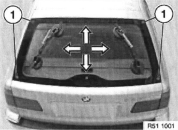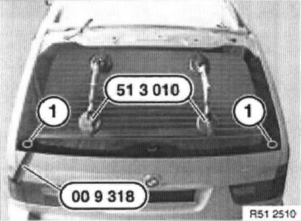 Attach special tool 51 3 010 to tool trolley twice. Moisten suction surfaces and secure rear window from outside. When reusing old rear window, remove residual adhesive down to 0.5 mm and replace upper dual-lock tapes.