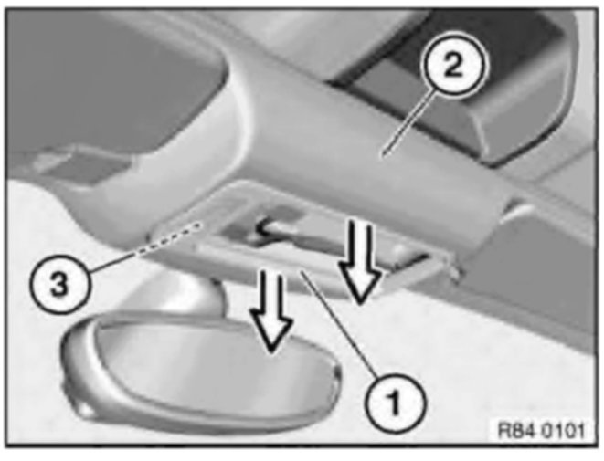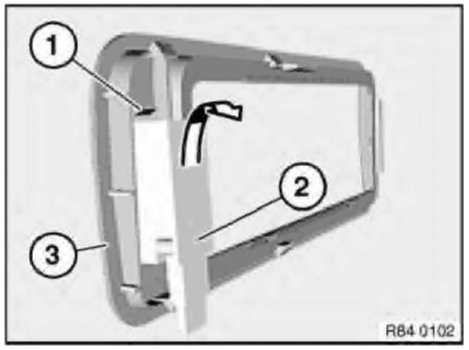 Expand catch (1) and feed hands-free microphone (2) in direction of arrow out of cowl panel insert (3).