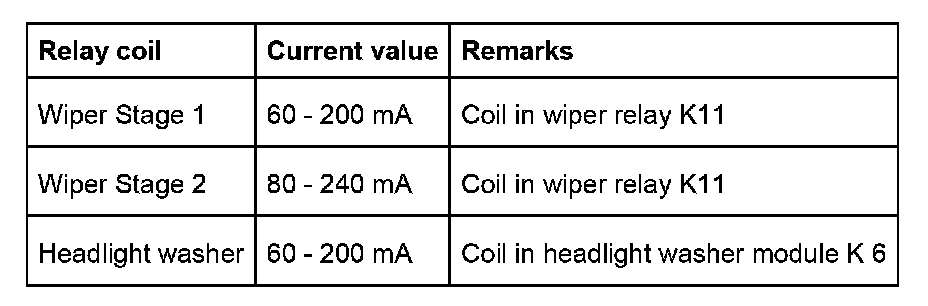 Diagnosis of the ZKE V general module makes it possible to read out the current values of the relay coils for the windshield wiper relays (stage 1 and stage 2) and the relay for the headlight washer system connected to the general module.