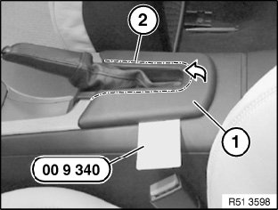 Remove handbrake lever cover (2) or armrest (1).