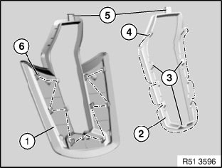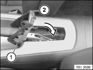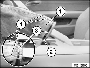 Following parts of handbrake lever cover (2) and armrest (1) must not be damaged or missing: