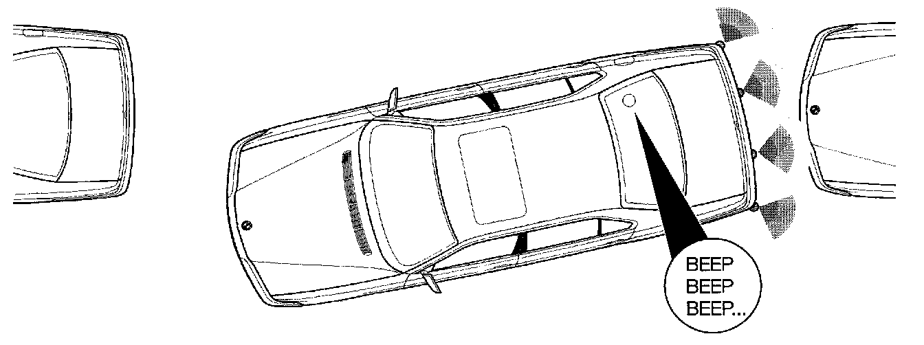The driver is warned, through an audible tone (beeping), when the vehicle comes close to another object. As the distance to the object decreases, the beeping frequency increases until a steady tone is produced (approx. 7 to 10 inches). As the distance to the object increases, the steady tone will return to a beep and stop when the vehicle moves away from the object.