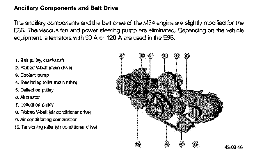 Ancillary Components and Belt DriveThe ancillary components and the belt drive of the M54 engine are slightly modified for the (E85)Z4) Z4.The viscous fan and power steering pump are eliminated. Depending on the vehicle equipment, alternators with 90 A or 120 A are used in the (E85)Z4) Z4.