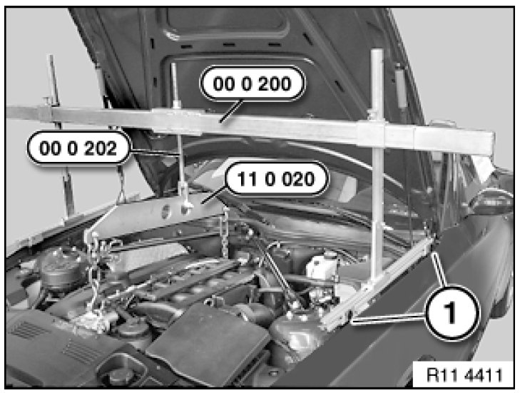 Fit suitable chains to special tool 11 0 020 and attach to both engine lifting eyes (1).