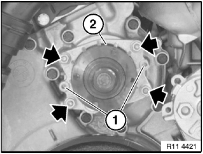 Tighten two screws (M 6) into thread (1) of water pump (2) and press water pump uniformly out of timing case.