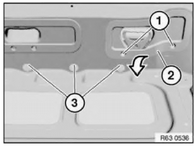 Pull auxiliary brake light (1) in direction of arrow out of rear lid (2) and remove.