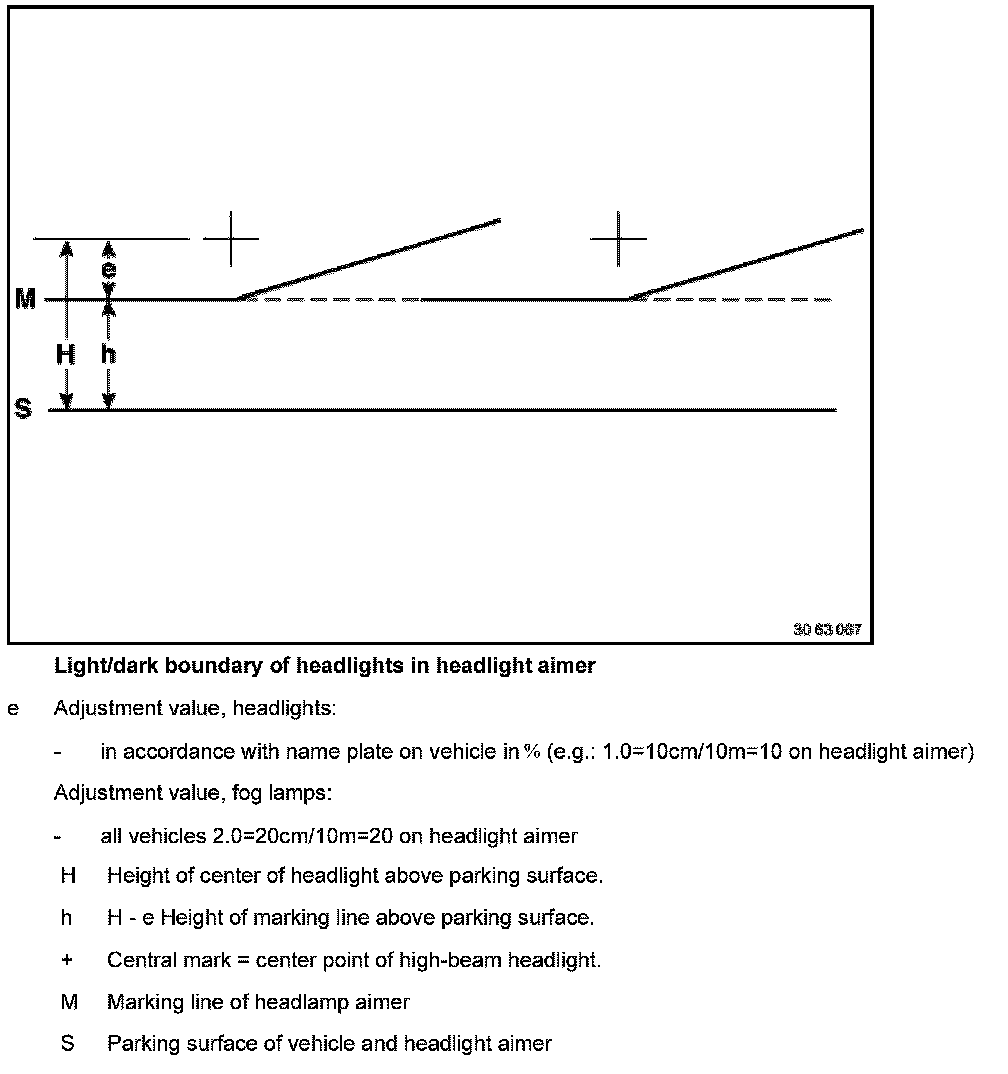 Align headlight aimer with vehicle longitudinal axis and parallel to parking surface. Set marking line (M) on aimer to distance (e). Scale graduations on aimer are equal to a gradient in cm at a distance of 10 meters.