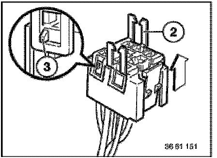 Place special tool 61 1 153 on relay carrier (1) and carefully pull in direction of arrow until retaining lugs (2) on relay carrier are raised.