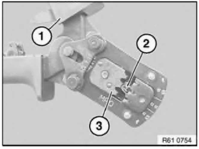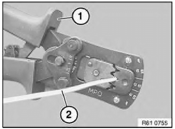 To crimp MPQ contacts, use pliers 61 4 321 (1) in conjunction with crimping head 61 4 325 (2) from crimping set 61 4 320.