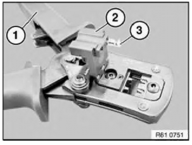 To crimp MQS contacts, use pliers 61 4 321 (1) in conjunction with crimping head 61 4 324 (2) from crimping set 61 4 320.