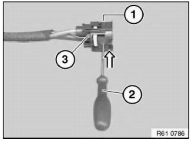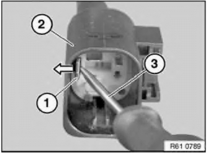 Press lock (1) with suitable tool (2) in direction of arrow out of socket housing (3).