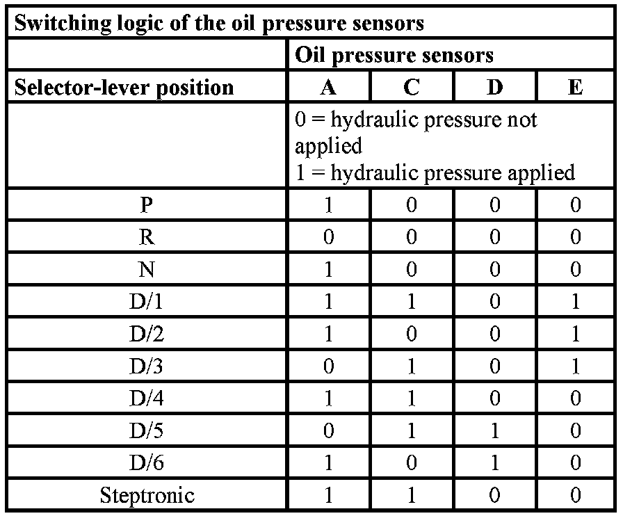 When hydraulic pressure is applied, the circuit is interrupted by the oil pressure sensors and no current flows. This results in different pressure states at the oil pressure sensors, depending on the shift mode of the transmission. The electrical signals are sent to the EGS control module.