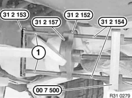 Attach special tool 31 2 153 with extensions (1) from puller set to control arm opening.