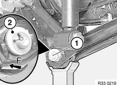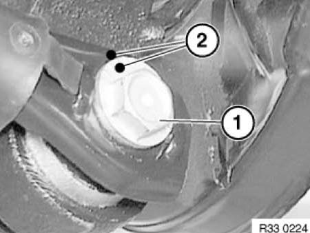 Mark position of eccentric screw (1) to control arm with center punch (2) (simplifies subsequent camber adjustment).