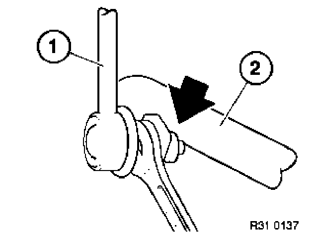 Release stabilizer link (1) from stabilizer (2) on left and right. Grip with open-end wrench.