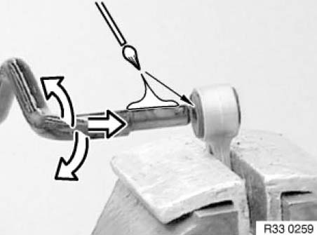 Moisten end of stabilizer bar and rubber mount inside with Circolight mounting agent, refer to BMW Parts Service.