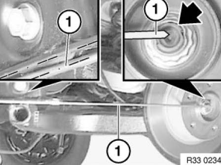 Install rubber mount with special tools 33 3 144/33 3 145 / 33 3 222 / 33 3 227 / 33 3 228 and M12 nut (1) until special tool 33 3 228 is slack.