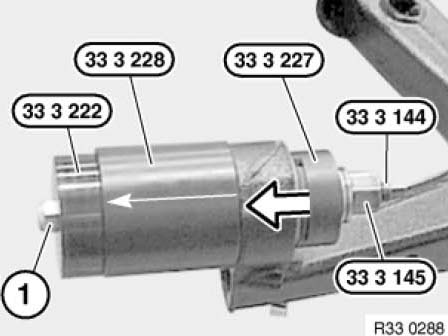 Pull out rubber mount with special tools 33 3 144 / 33 3 145/33 3 222/33 3 227/33 3 228 and M12 nut (1).