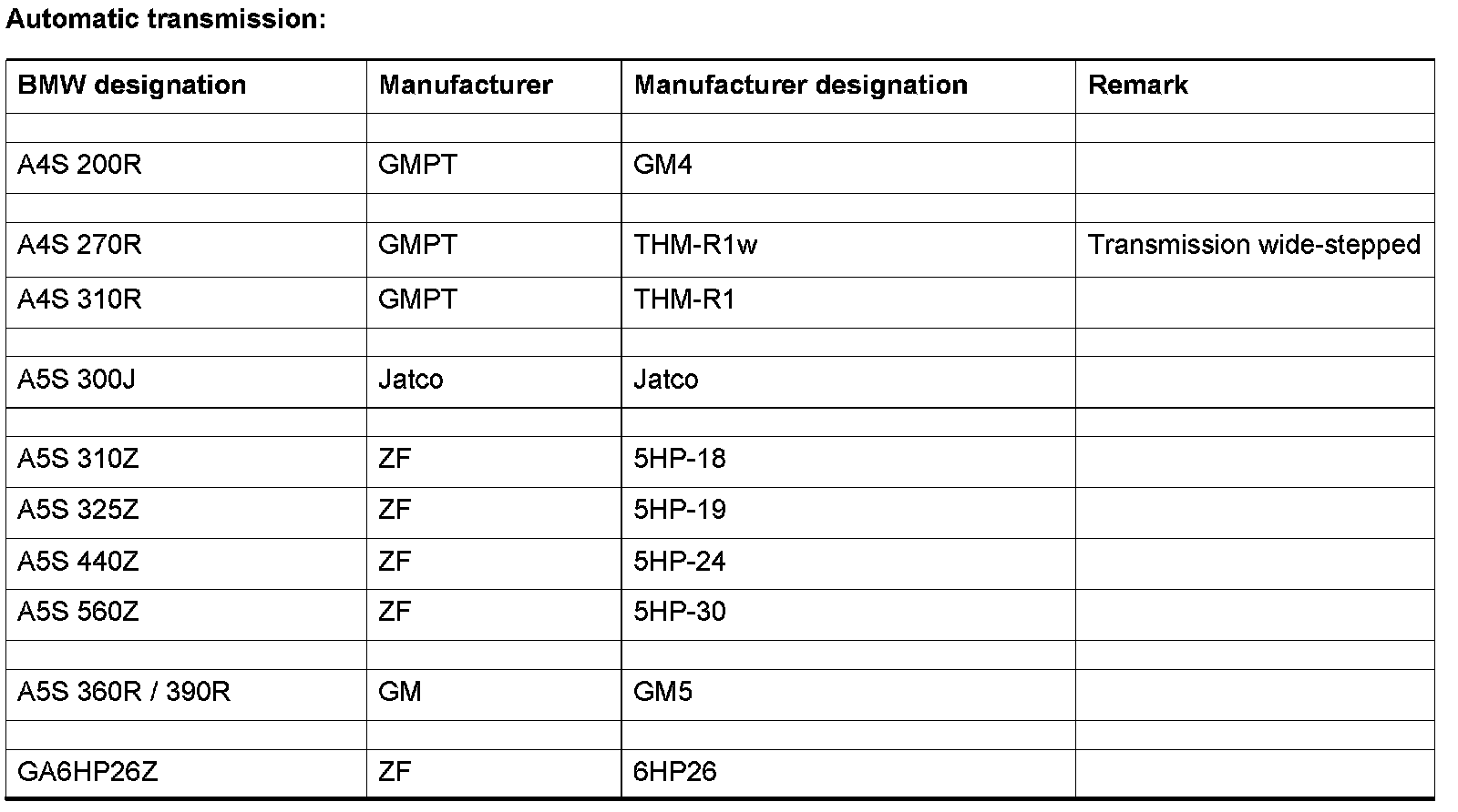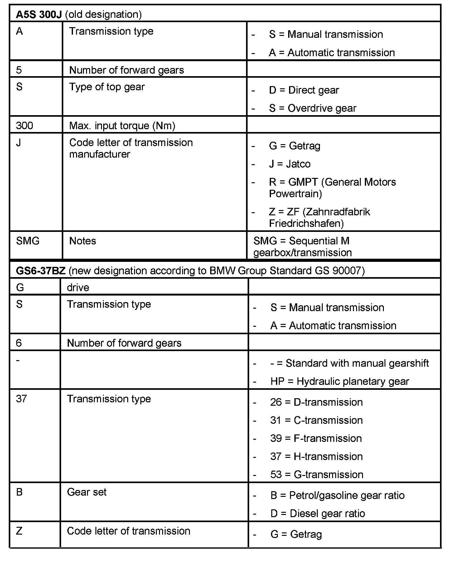 Z4 (E85) Transmissions ApplicationsDesignations