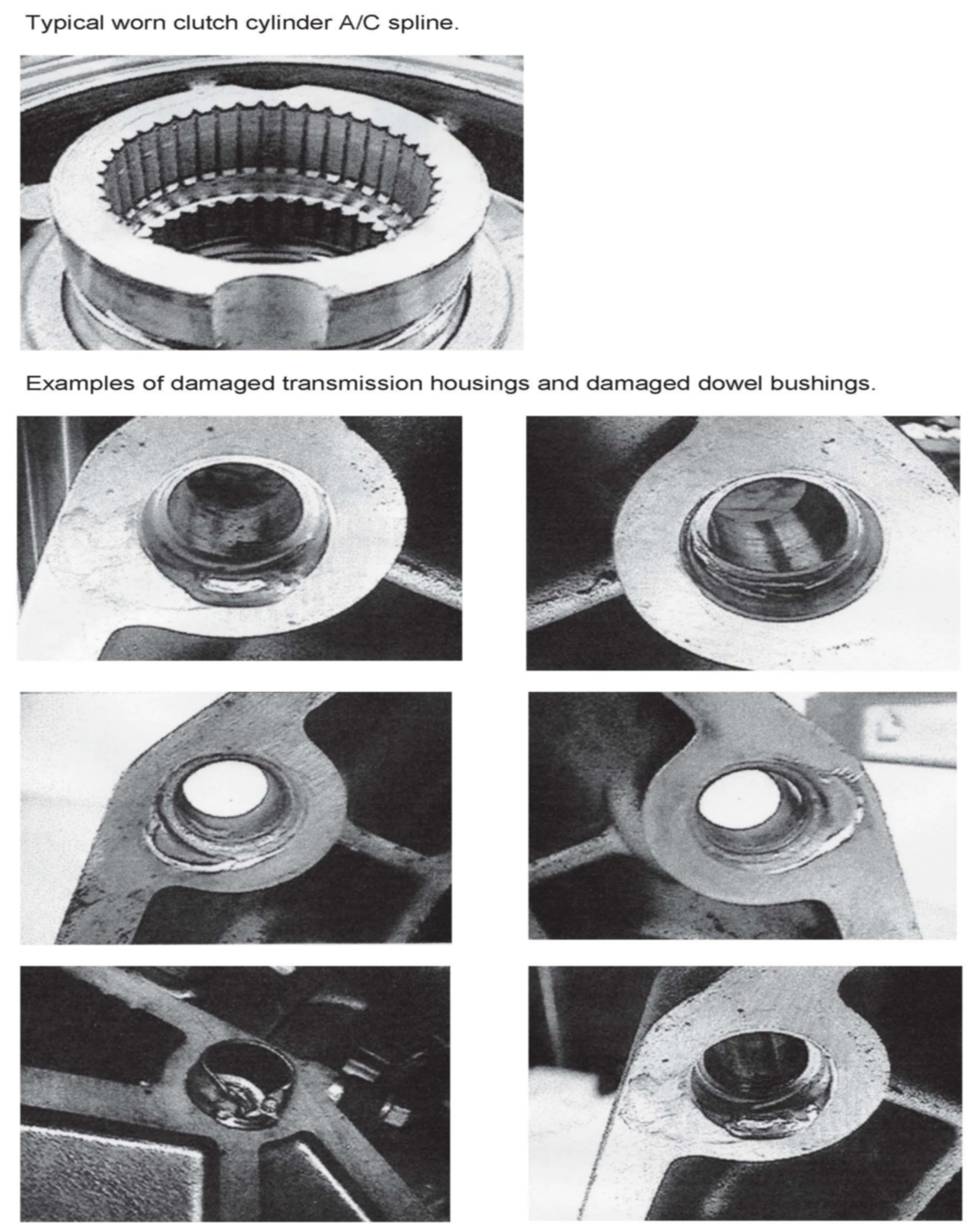 These transmission failures and or damages are often caused by damaged, misaligned or missing dowel bushings between the engine block and the transmission housing. The resulting transmission-to-engine misalignment will gradually wear off the splines on the input shaft of the clutch cylinder until power transfer is no longer possible.