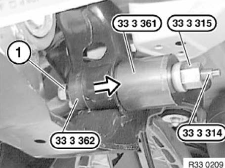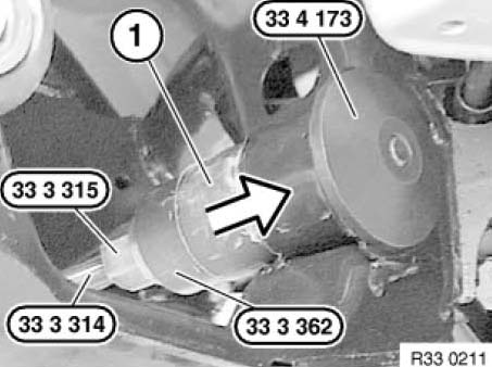 Install rubber mount (1) with special tools 33 3 314/33 3 315 / 33 3 362 and 33 4 173 as far as it will go.