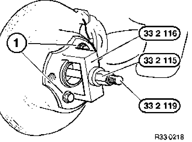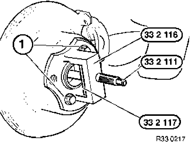 Screw on special tools 33 2 111 / 33 2 116 and 33 2 117 with 3 wheel studs (1).
