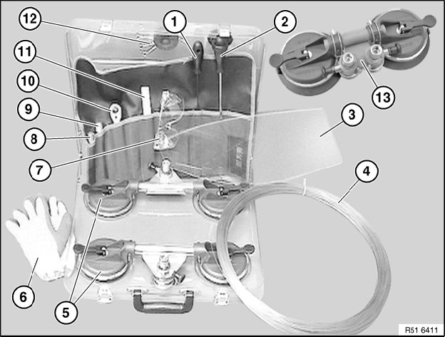 - To avoid damage and if necessary dirt, protect A-pillars, roof and instrument panel by means of parabolic tool (1) or plastic washer (2)