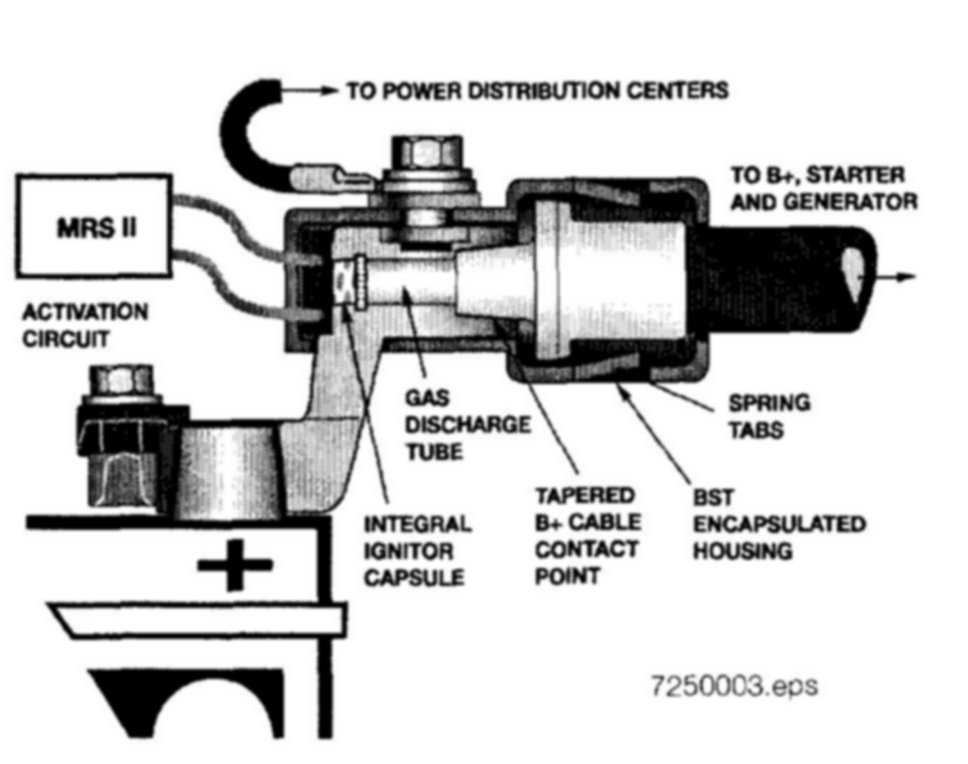 The BST is designed to minimize the chance of an under-hood fire by disconnecting the connection between the battery and the starter/alternator circuit. Any time an airbag is deployed the BST is triggered. Once the connection in the BST is interrupted the car will not start, however the interior electronics will still function (i.e locks, windows, lights, etc).