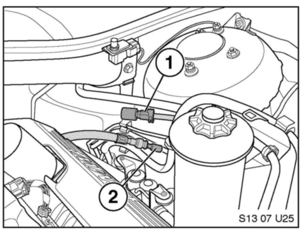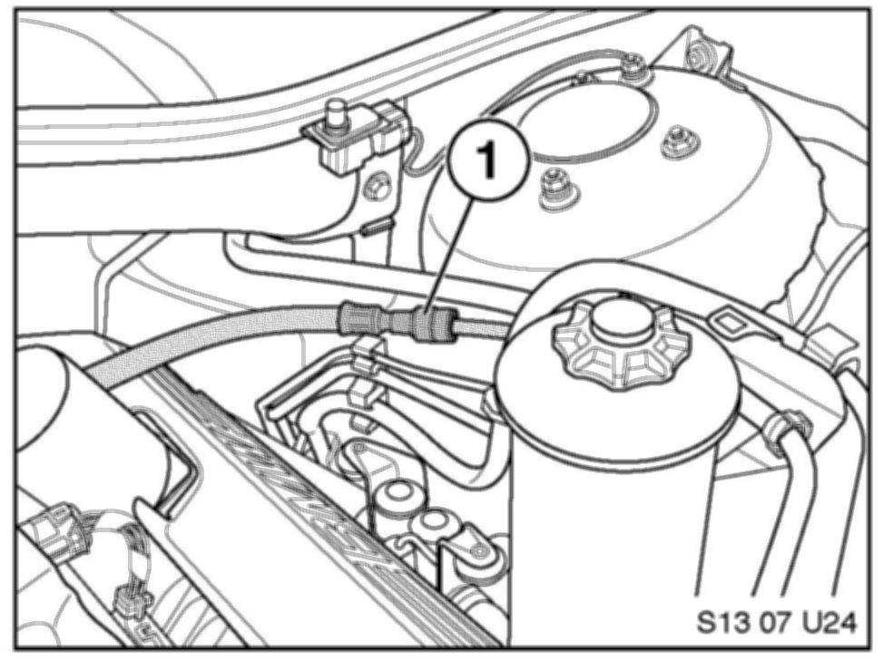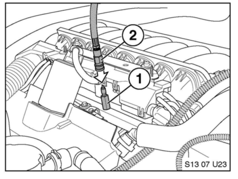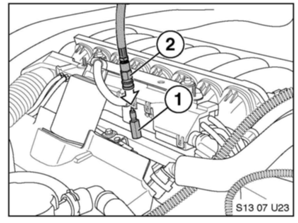 10. Disconnect the fuel line from the fuel rail connection (1).