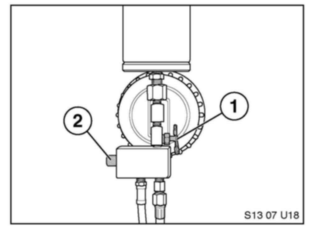 18. Release the pressure from the applicator cylinder with the pressure release button (2). Close the shutoff valve (1).