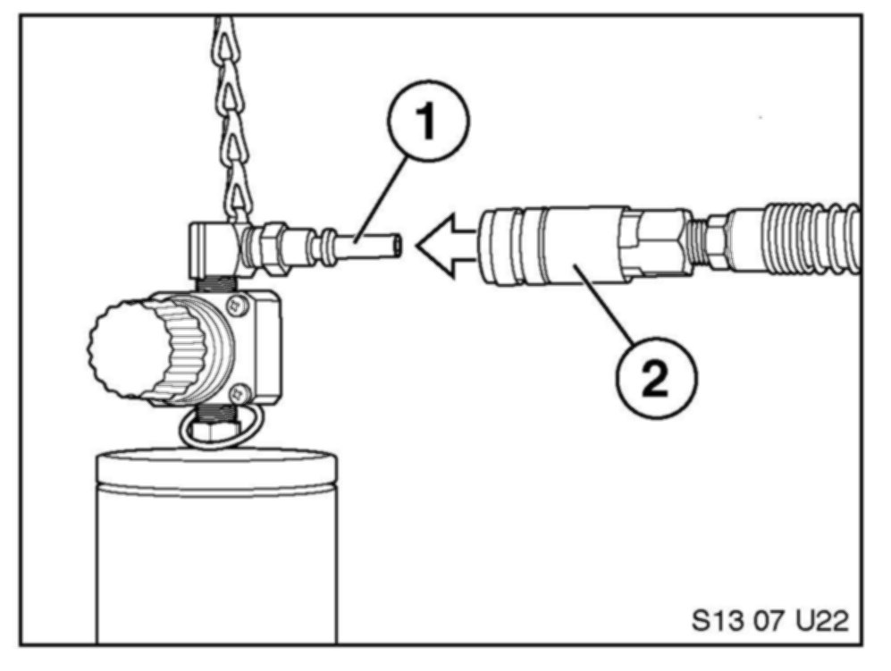 13. Connect the shop air supply (2) to the application cylinder (1).