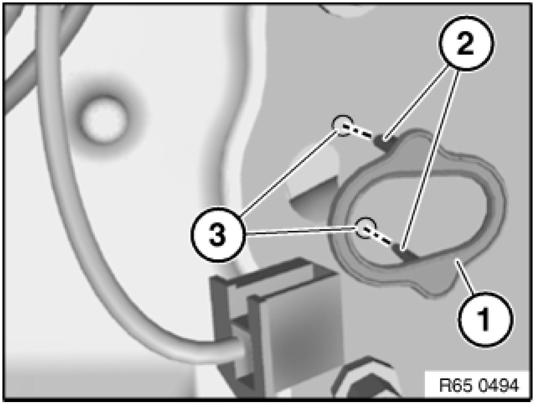 - Make sure front door sensor seal (1) is correctly seated. Pins (2) must be exactly seated in mountings (3).