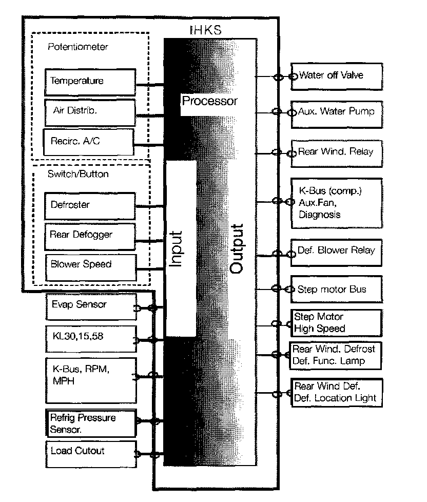 The air flow is adjusted by a 360° potentiometer. The flaps are controlled by 3 stepper motors (bus) that operate the defroster, face vent and footwell flaps. Flap control is dependent on the position of the air distribution knob as well as the position of the temperature knob.