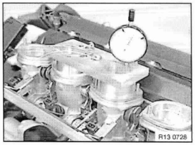Position dial gauge plates on throttle body of cylinders 2 and 3 and throttle body of cylinders 6 and 7. Mount dial gauges with inserted extension pins in dial gauge plate supports for measuring at throttle bodies 3 and 6.
