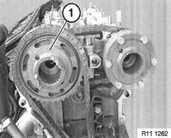 Take care: the supporting ring can easily fall out when removed. Remove spline hub (1) with plate spring and supporting ring.