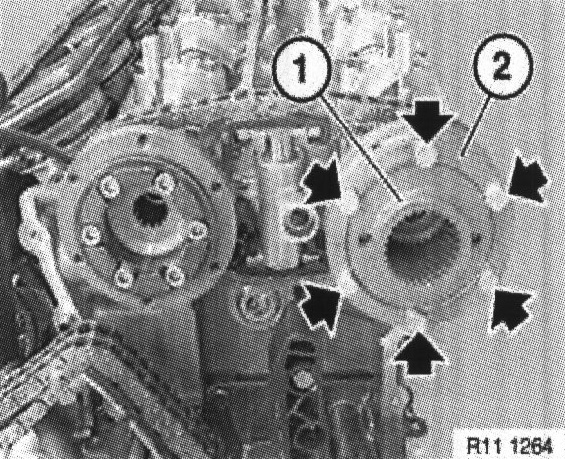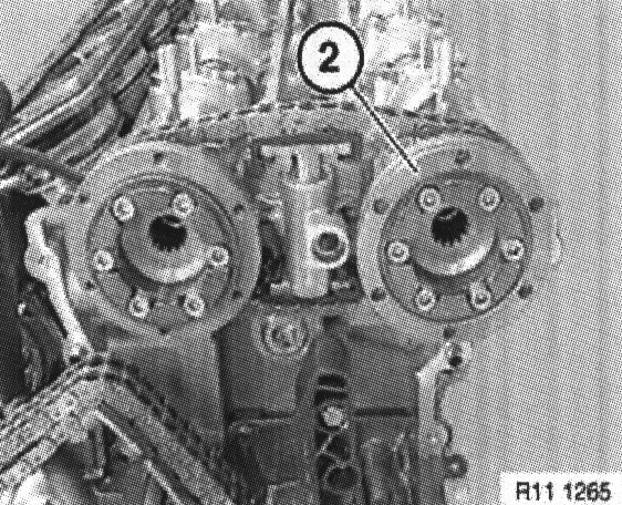 Withdraw toothed sleeves (2) from exhaust and inlet camshafts.