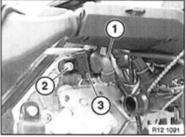 Carefully twist air duct (2) upwards until it is no longer locked in firewall. Pull air duct (2) forwards and remove towards top.