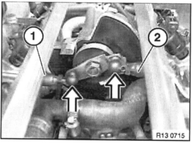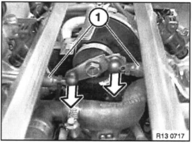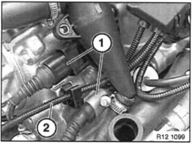 Unclip both cable strips (2) from fuel injectors, tilt up and tie back (e.g. to engine hood).