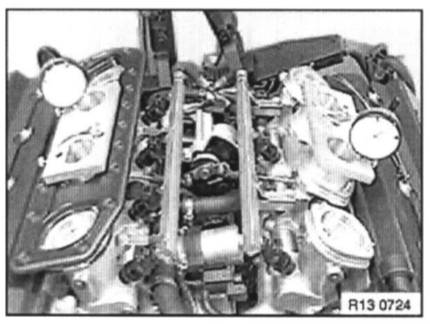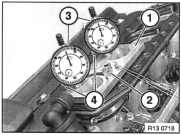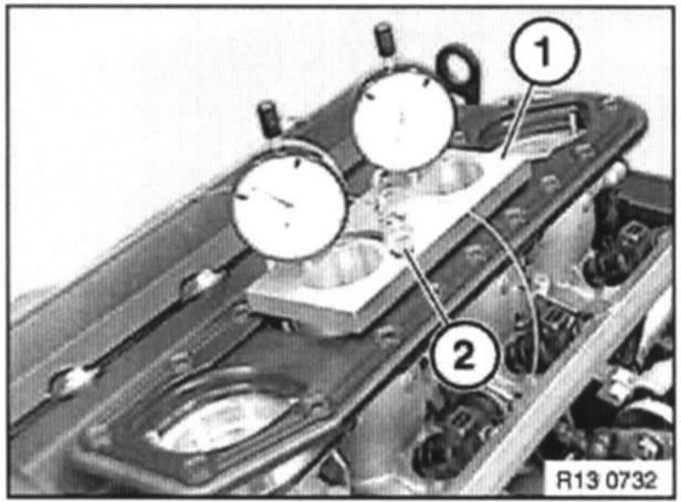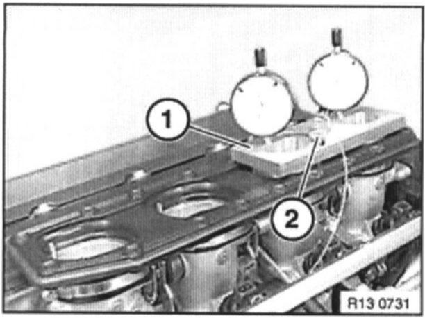 Place dial gauge plate (1) on throttle body of cylinders 1 and 2. The dial gauge supports must rest on the side of the throttle body facing the cylinder head.
