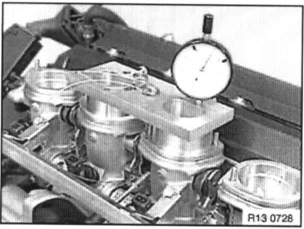 If the still engaged throttles 3 and 4 are opened a little and the dial gauge immediately indicates movement in throttle 2 in the process, the adjusting screw between throttle bodies 3 and 4 is unscrewed too far.