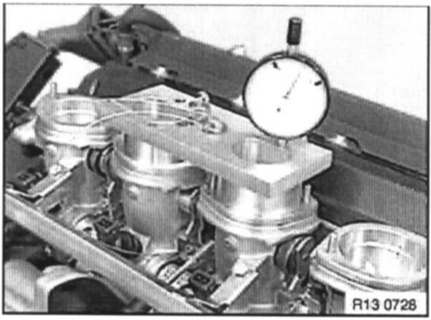 Position dial gauge plates on throttle body of cylinders 2 and 3 and throttle body of cylinders 6 and 7. Mount dial gauges in dial gauge plate supports for measuring at throttle bodies 3 and 6.