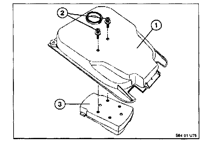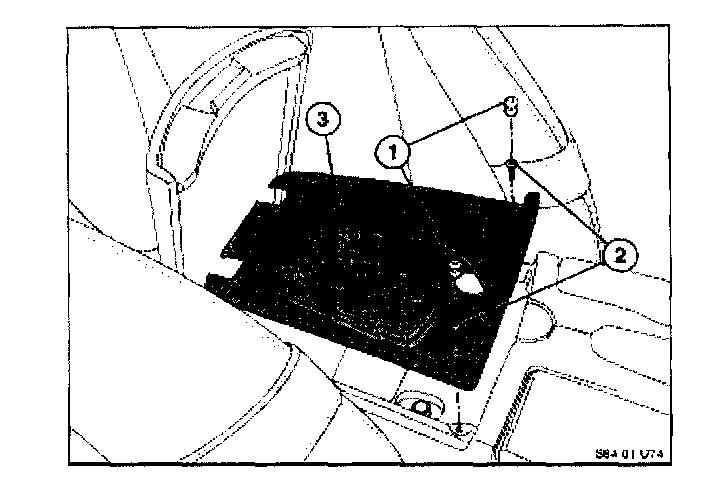 18. Remove the center console tray (3) from vehicle by removing the two plugs (1) and screws (2) as shown.