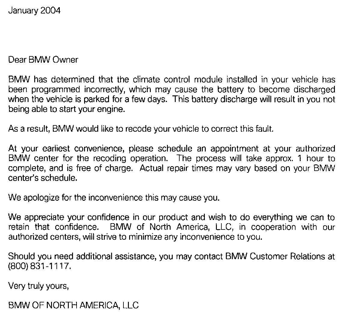 If two or more IHKA settings are modified during an ignition cycle (e.g. temperature setting and blower setting), the result is an increase in closed circuit current of approximately 800 mA. This could cause a discharged battery when vehicle is not used for 2 to 3 days.